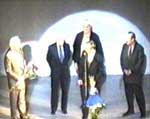 Ведущий. И сейчас мы хотим, чтобы прозвучало еще одно приветствие в честь юбиляра. Его приветствуют... его родная киностудия имени Горького. Мы приглашаем к микрофону кинорежиссера Владимира Грамматикова. (На сцену выходят: В. Грамматиков, П. Арсенов, М. Богин, И. Клебанов.) Ведущая. Евгений Павлович, пожалуйста... (Крылатову). Добрый вечер (Грамматикову). В. Грамматиков. Здесь еще Паша Арсенов.... Да, Пашенька, очень приятно.... Миша.... Здрасте.... И... Игорь Клебанов. Честно говоря, когда выходишь на эту сцену и видишь такое количество людей, то хочется петь. И если мы бы спели все песни, написанные Евгением Павловичем для студии Горького, а их более сорока пяти... правильно?... Е. Крылатов. Да, приблизительно. В. Грамматиков.... то мы бы здесь сидели, наверно, дня два-три. Вот поэтому мы это и делать не будем. Но мы хотим сказать, что в последнее время, Евгений Павлович, мы редко видим вас на студии, но хотим заверить вас, что двери нашей студии открыты. Вот. Мы очень ждем вас, и студия, и все дети России ждут вас, и надеемся, что встреча будет очень близкой, творческой и рабочей. Приходите к нам, пожалуйста. (В. Грамматиков поворачивается к П. Арсенову, жестом показывает на микрофон.) П. Арсенов. Можно, да? В. Грамматиков. Конечно. М. Богин. Да. В. Грамматиков. Конечно. (В .Грамматиков подходит к Е. Крылатову и вручает букет цветов.) П. Арсенов. Может быть я.... Сейчас, я очень хочу сказать.... Я недолго займу ваше внимание. Все-таки, шестьдесят пять лет не каждый день. Двадцать семь лет нашего общения творческого, только творческого, тоже не каждый день, но я хочу передать слово в какой-то степени оказавшемуся гостем нашей сегодня, вот, компании, приветствующей... Женю Крылатова, Мише Богину, вот это режиссер фильма "О любви". Это вот человек, с которым Женя впервые действительно в большом кино... написал музыку. По моему, там пронзительная тема, если кто ее помнит. Поэтому, Миша Богин. Кинорежиссер фильма "О любви". М. Богин. Добрый вечер. Этак... лет тридцать тому назад, значит, я закончил эту картину. И вместе с монтажером Марьей Сергеевной Шиховской мы решили посмотреть: что у нас получилось. И я вижу: сидит человек в коридоре. И я говорю: "У вас есть полтора часа?" Он говорит: "Есть". Я говорю: "Не могли бы посидеть с нами, у нас, правда, в фильме нет музыки, нет шумов... Ну просто скажете... Ваше впечатление". Значит, закончился просмотр. И он... так замечательно... стал говорить о нашем фильме. Я говорю: "А как вас зовут?" Он говорит: "Зовут меня", - говорит, - "Крылатов Женя". Я говорю: "А по профессии вы кто?" А он говорит: "Я - композитор". Он говорит: "Вы знаете, я бы мог даже написать музыку к вашему фильму". Я говорю: "Ну, я не знаю". Я говорю: "Вы знаете, у нас уже есть композитор...". "Ну", - говорит, - "жаль...". "Ну, знаете что, я вам дам шанс. Сегодня пятница, вот если в понедельник вы принесете тему, то... мы вас возьмем". И, значит, он написал тему, тему замечательную. И с тех пор Женя работает в кино в художественном. Для этого музыку, по-моему... Он написал балет "Аленький цветочек" для Большого театра, писал... для мультипликационных фильмов, но в кино еще не работал. Так что мне выпала честь... по-настоящему... стать первым режиссером, для которого Женя написал музыку. И мы друзья. Настоящие друзья. И я живу, так уж жизнь сложилась, я живу в Нью-Йорке. И часто я работаю здесь. И не было случая, чтобы Женя меня не встретил. Это у
