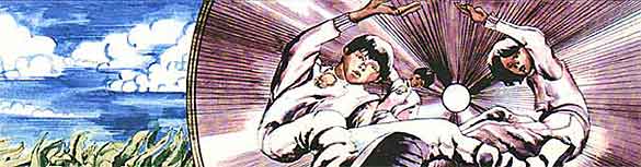 Кабина космоплана. Наташа, Вадим и Федя на своих местах. Вадим раздвигает шторки иллюминаторе, и нежно-розовый свет озаряет внутренность кабины.